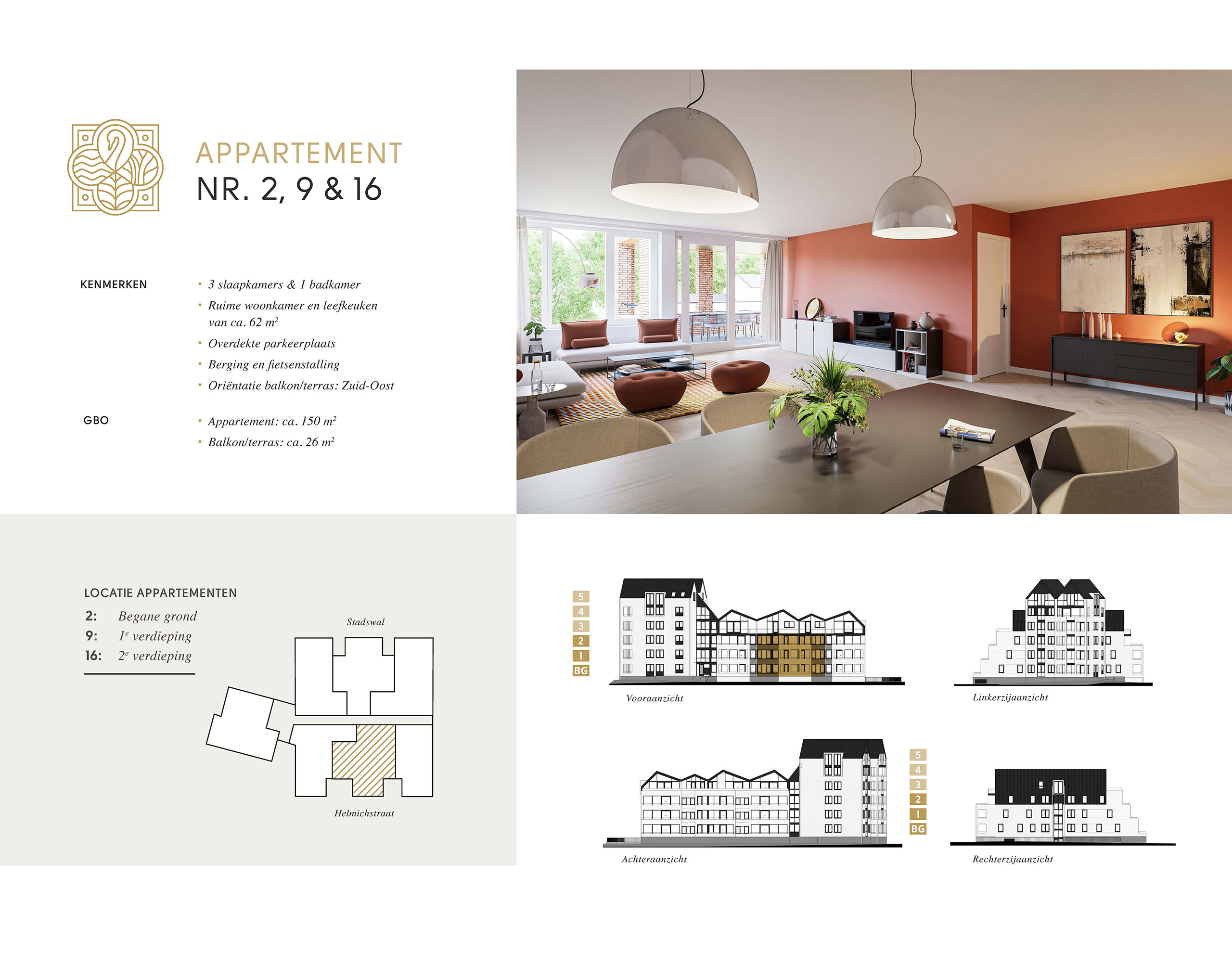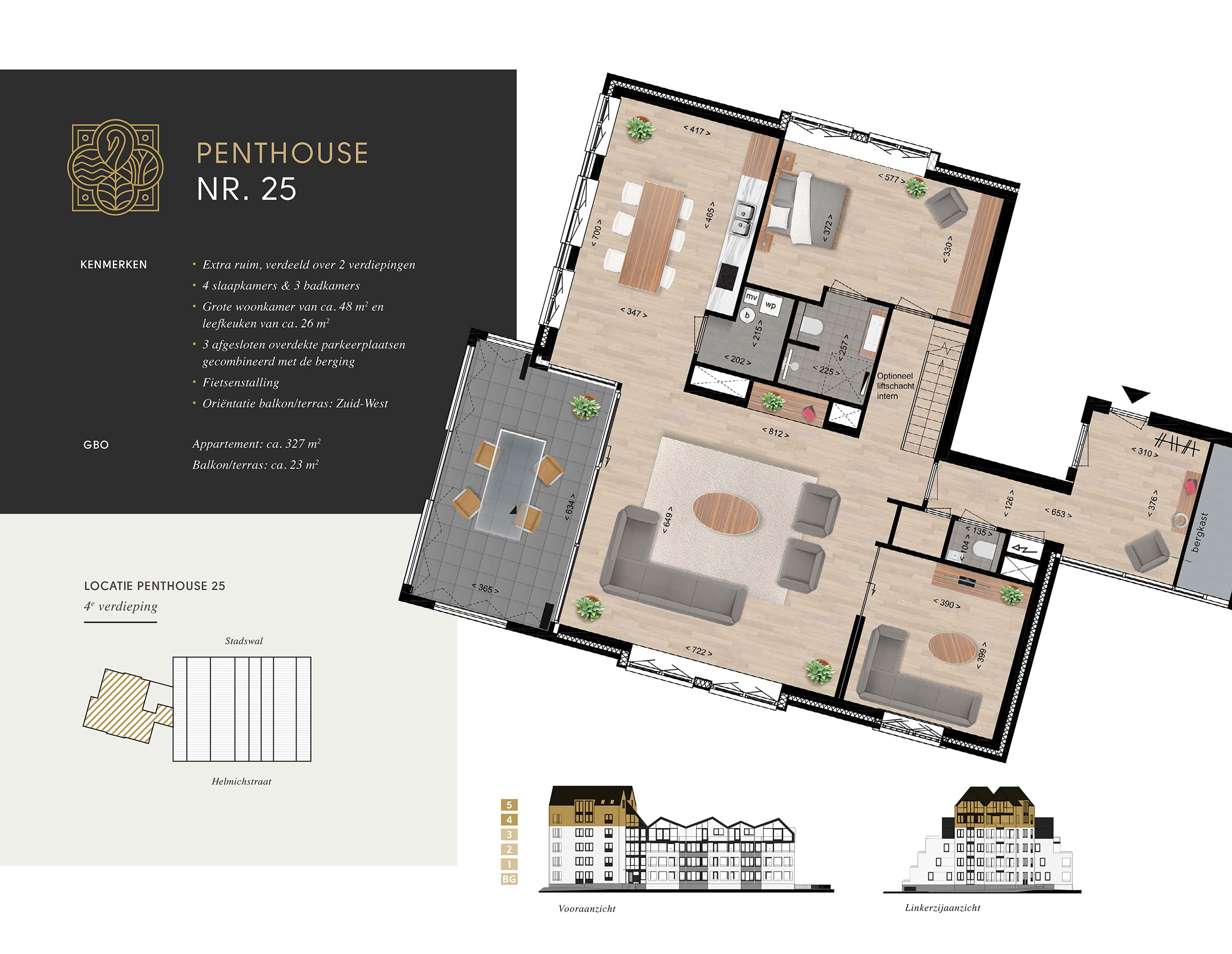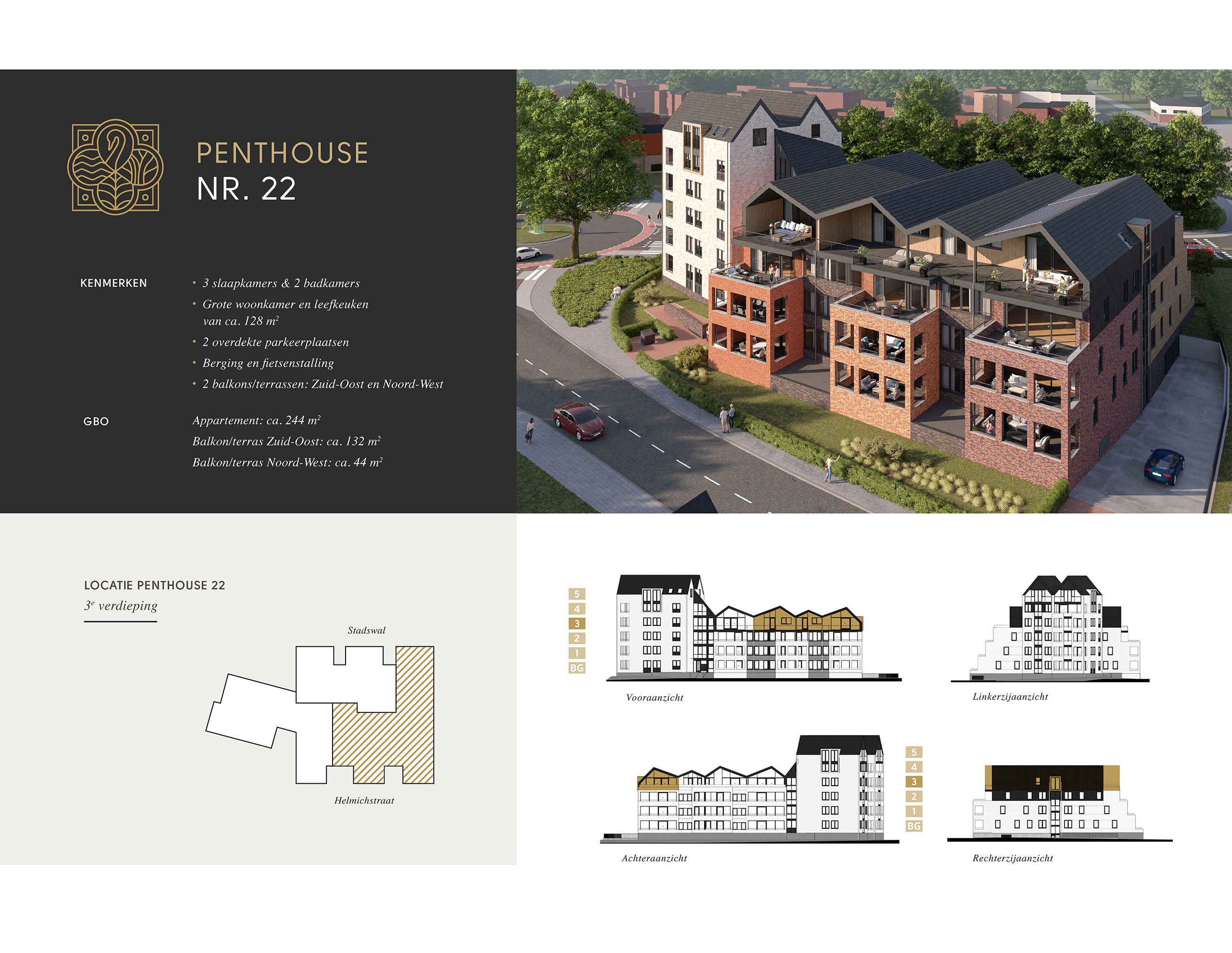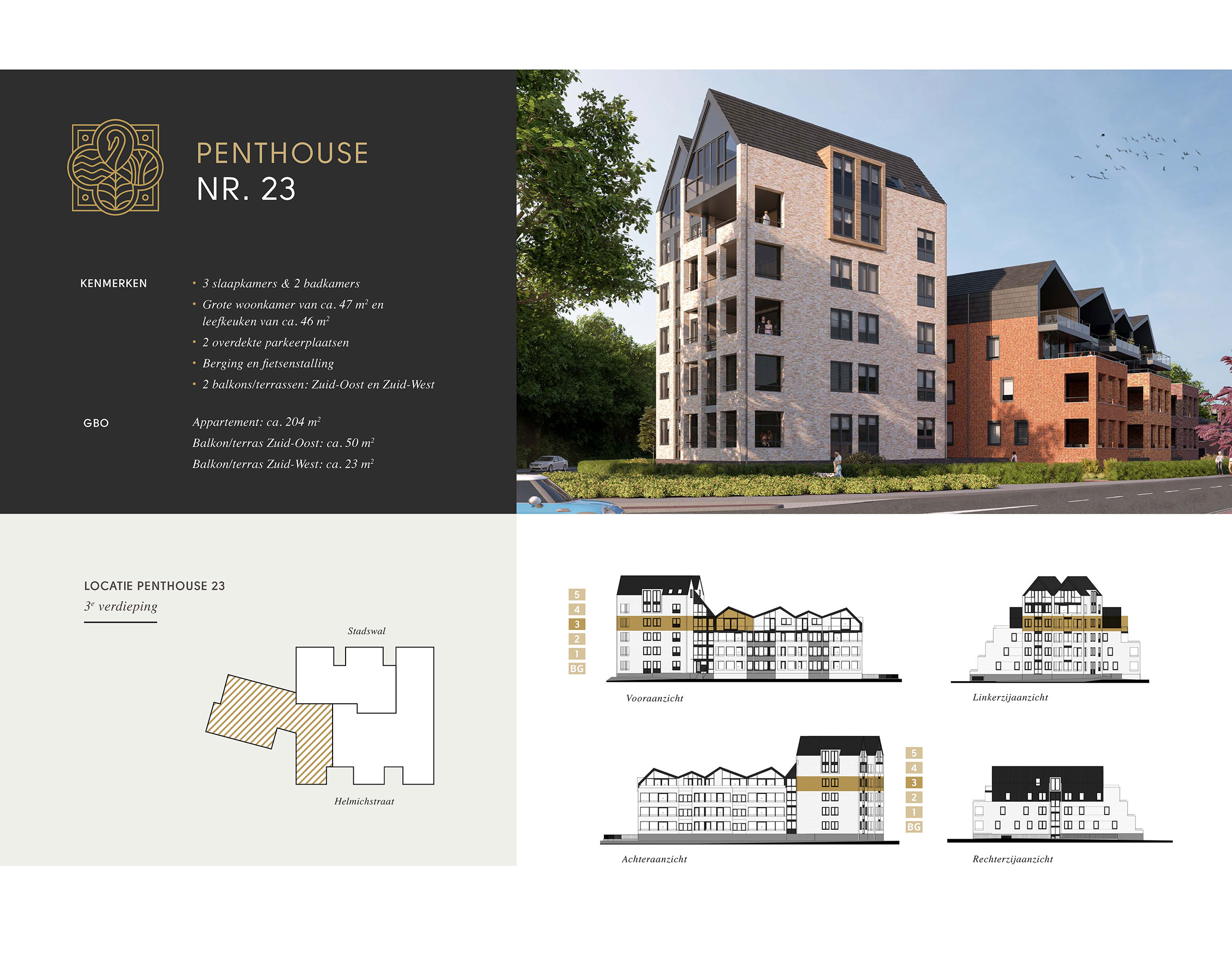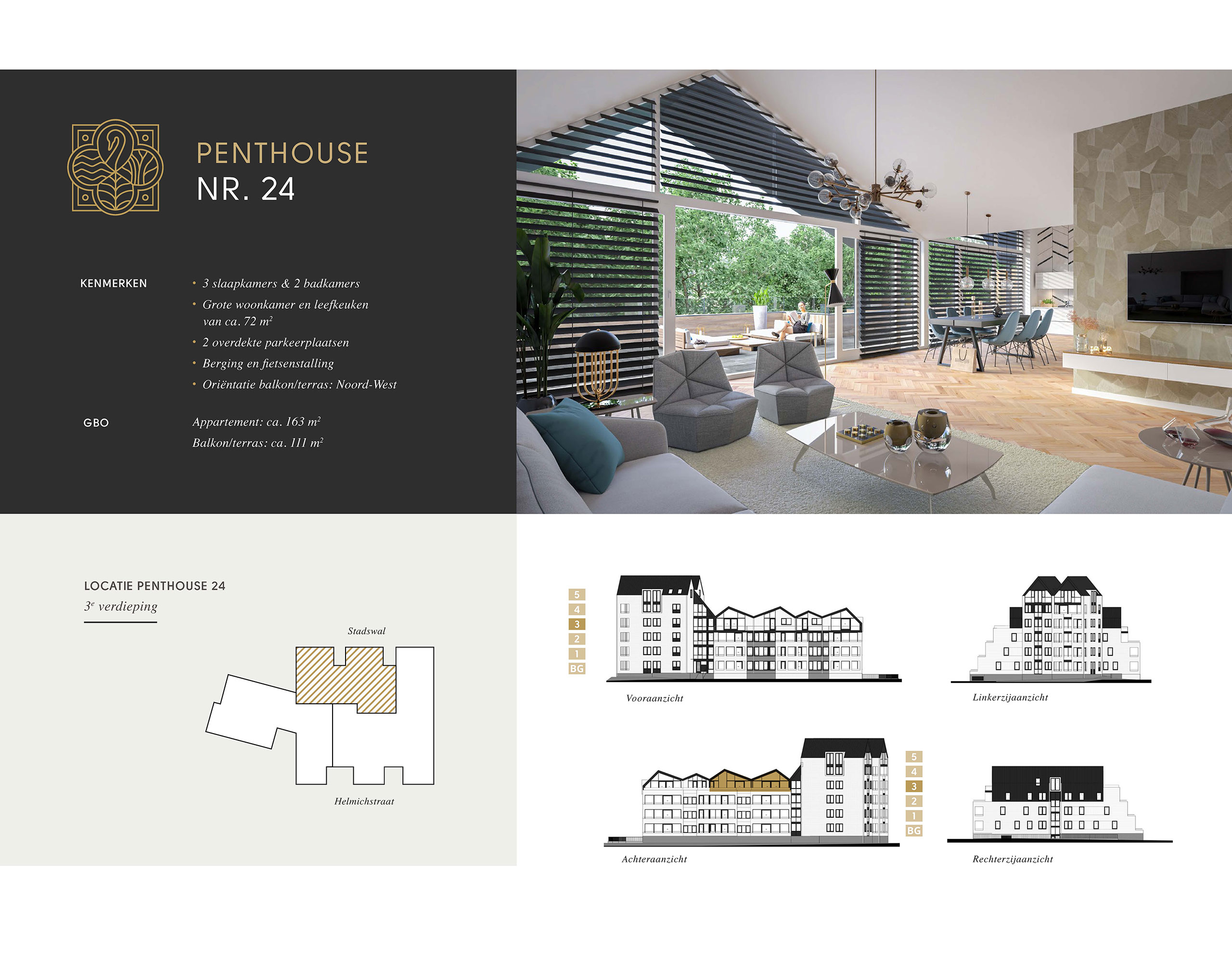 Het bovenste penthouse in de toren beschikt over twee woonlagen, met extra ruimte voor slaap-, hobby- of studieruimte. Het daaronder gelegen penthouse loopt vanaf de toren door naar het lager gelegen gebouw. Alle appartementen en penthouses hebben een berging, inpandige parkeerplaats en fietsenstalling in het souterrain.