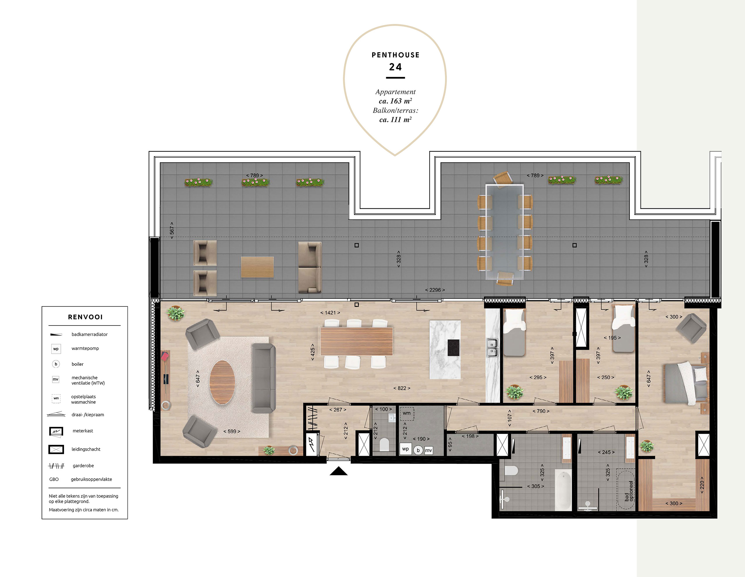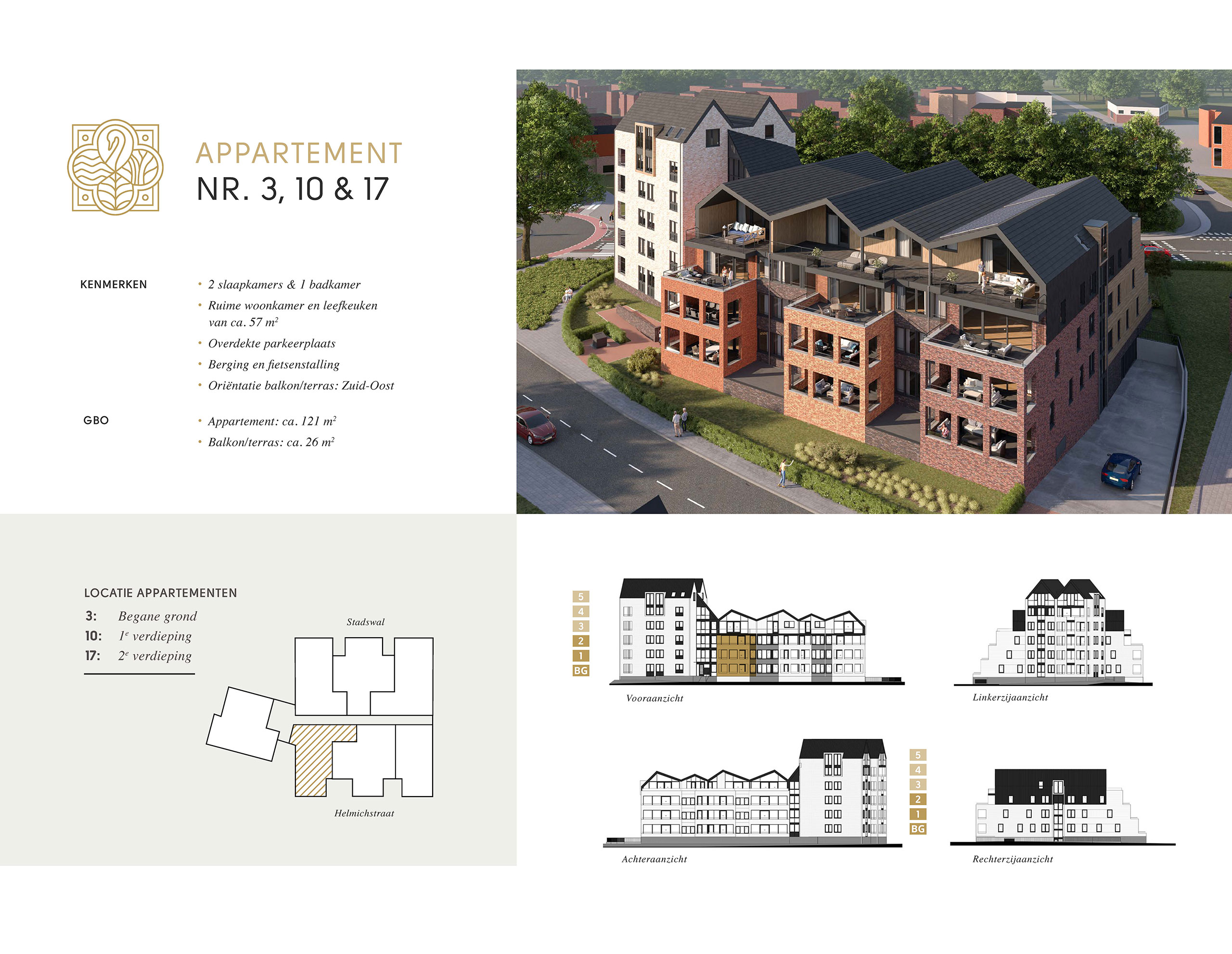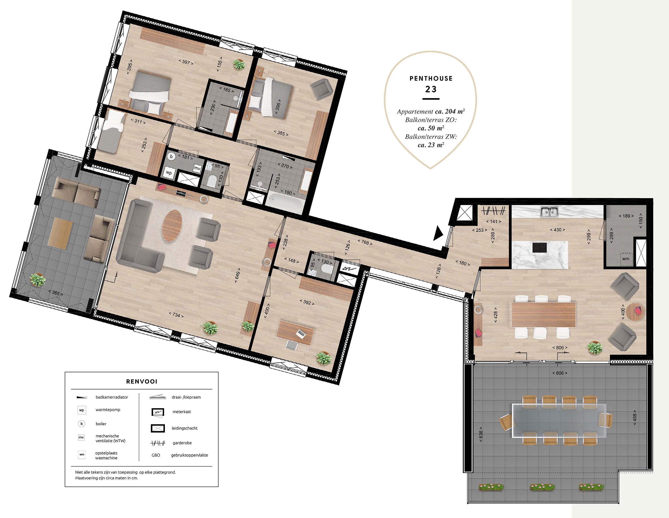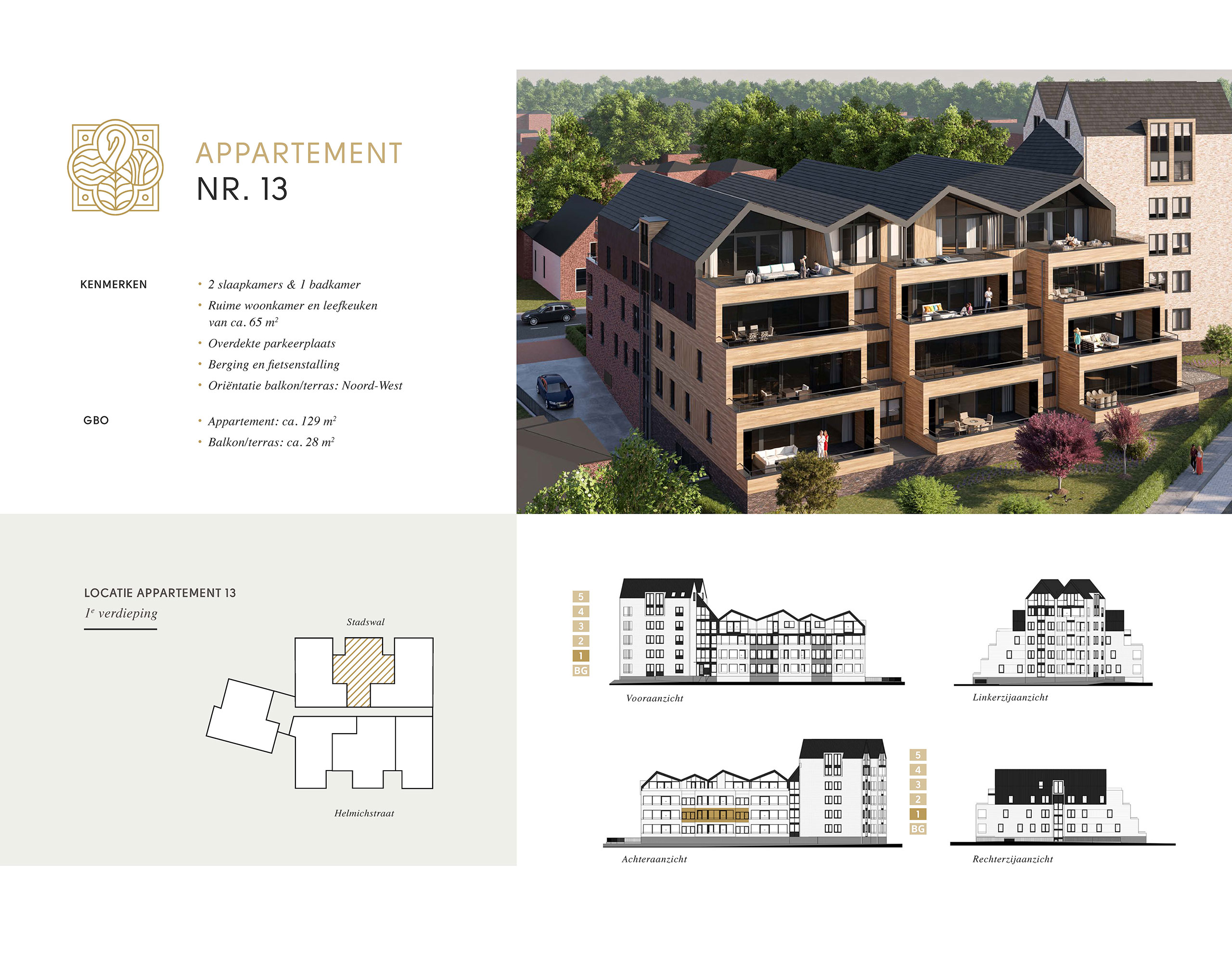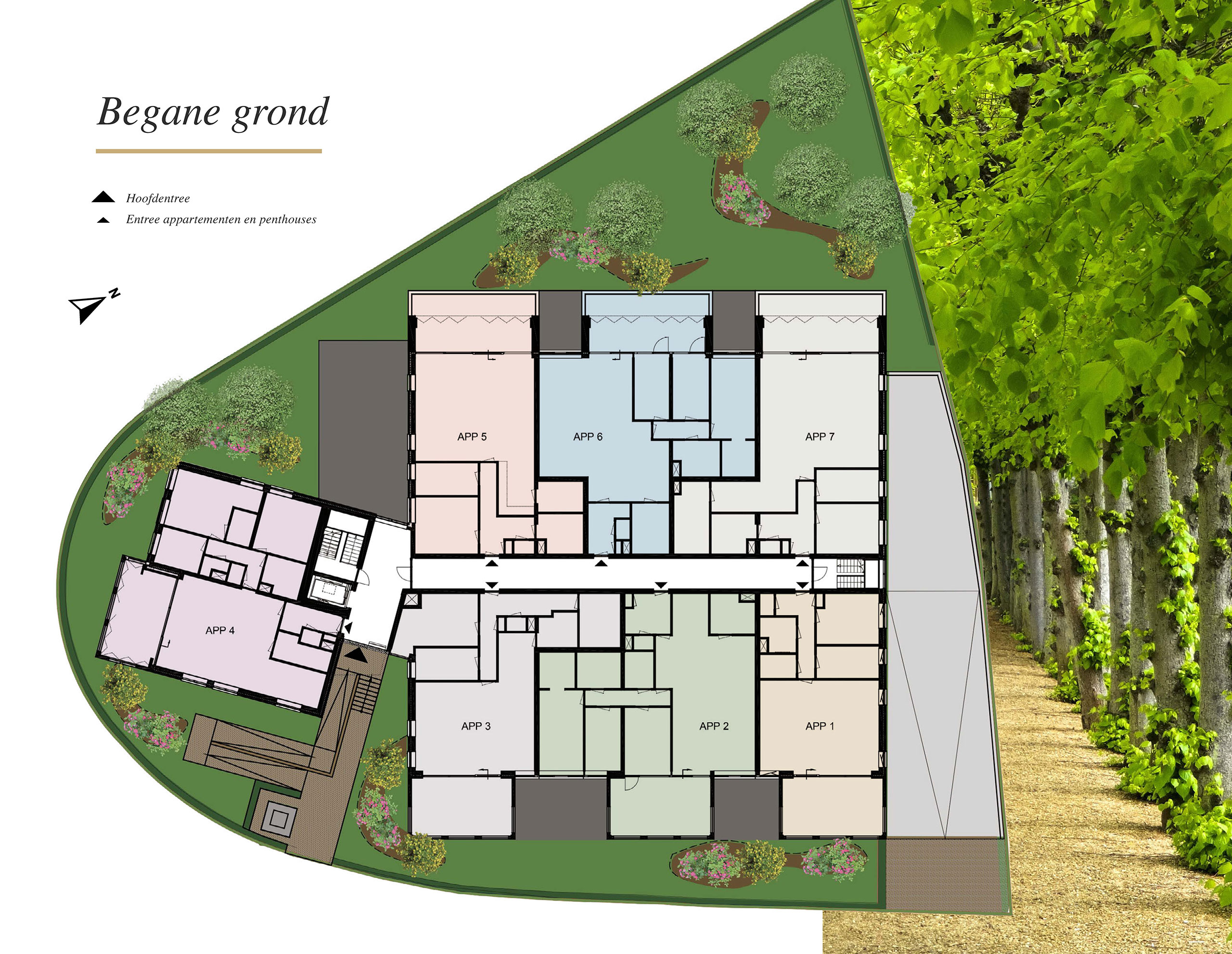 Het bovenste penthouse in de toren beschikt over twee woonlagen, met extra ruimte voor slaap-, hobby- of studieruimte. Het daaronder gelegen penthouse loopt vanaf de toren door naar het lager gelegen gebouw. Alle appartementen en penthouses hebben een berging, inpandige parkeerplaats en fietsenstalling in het souterrain.
