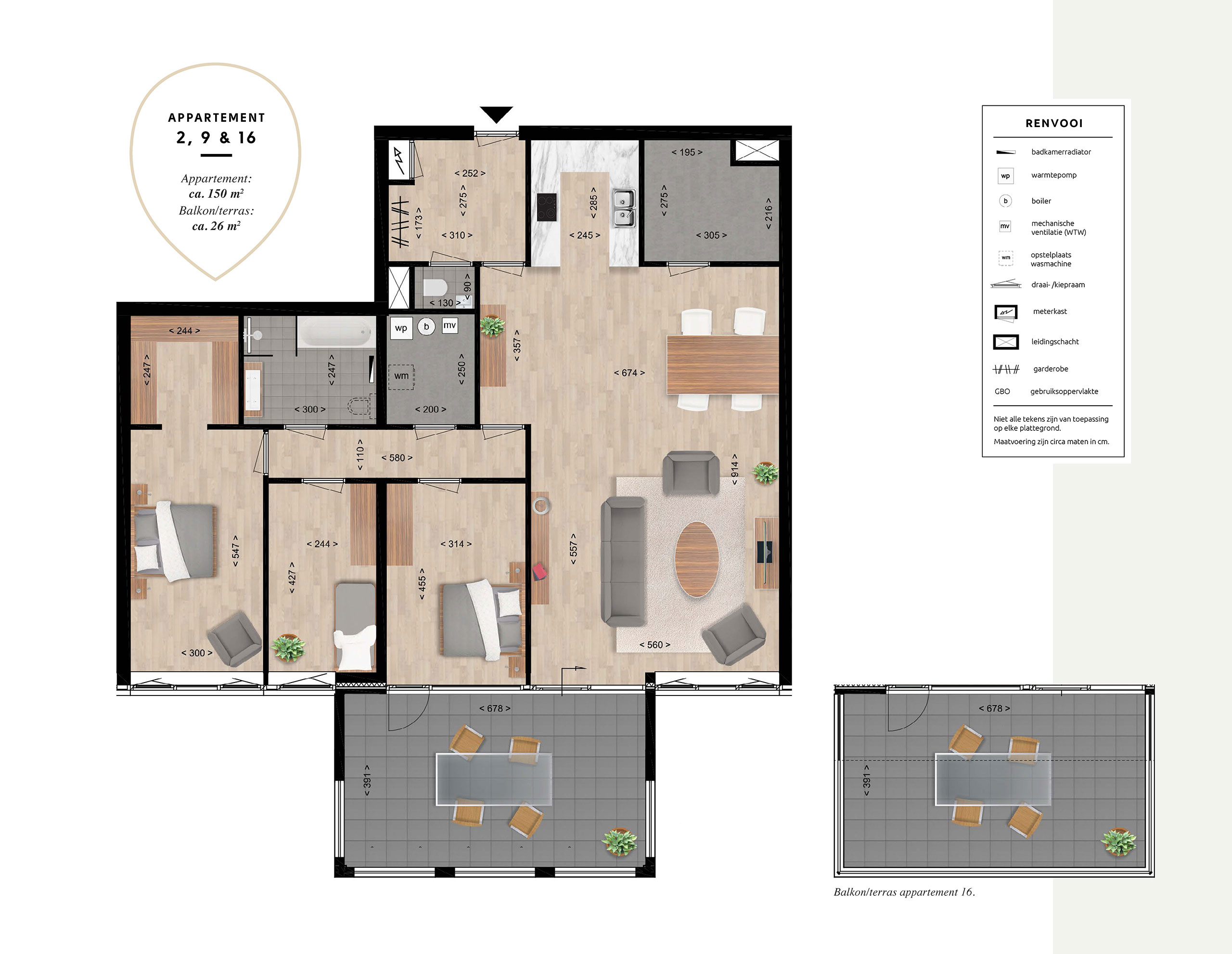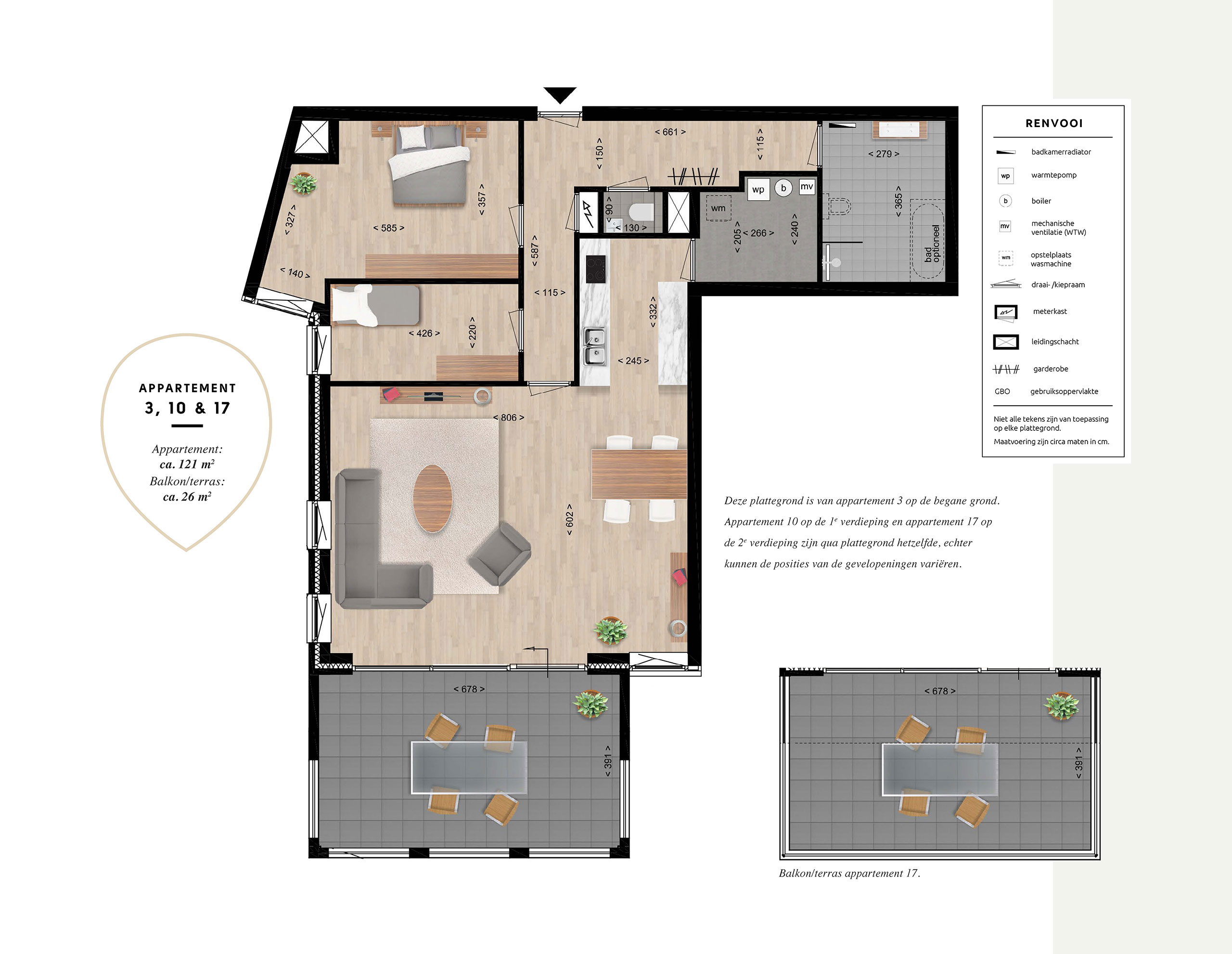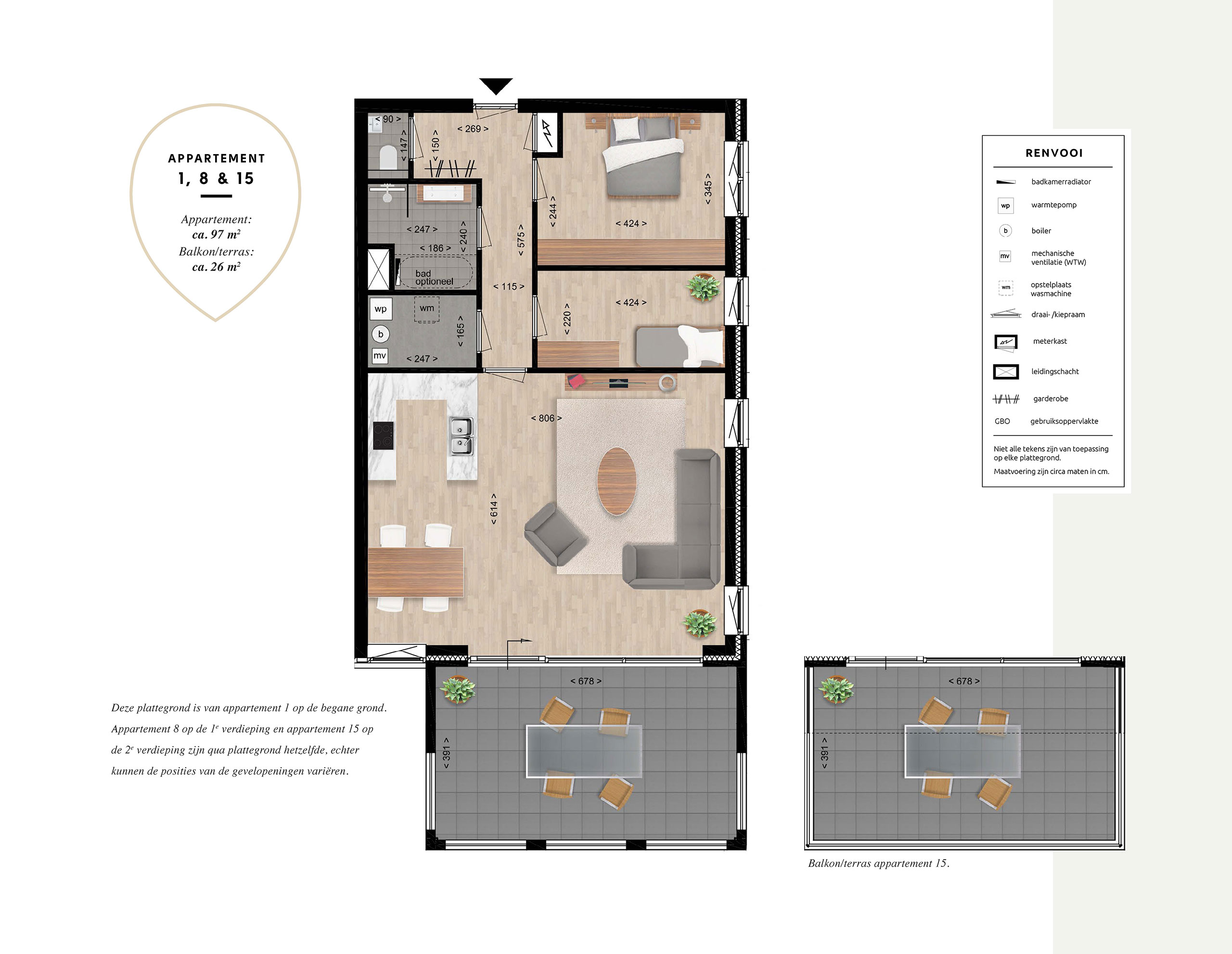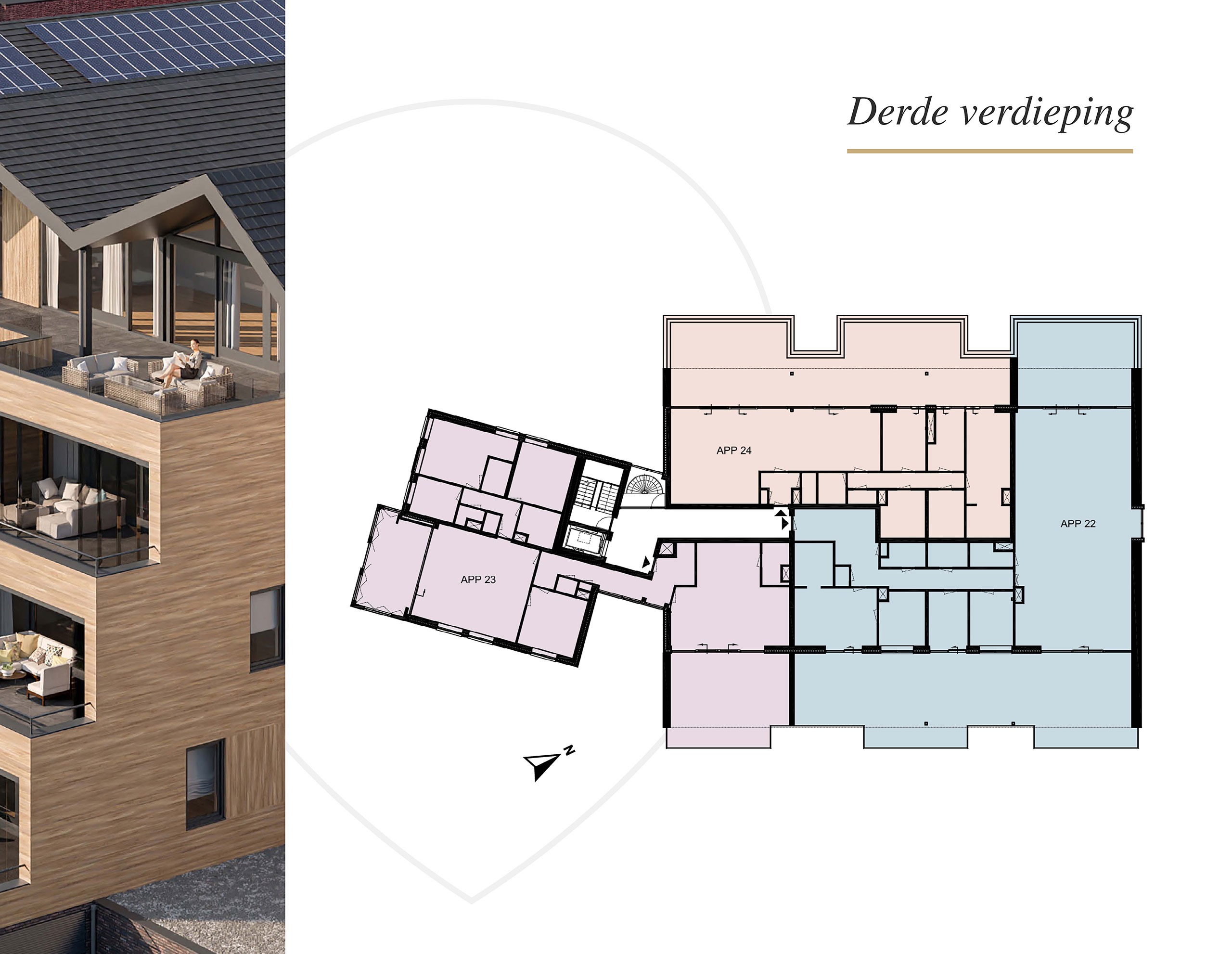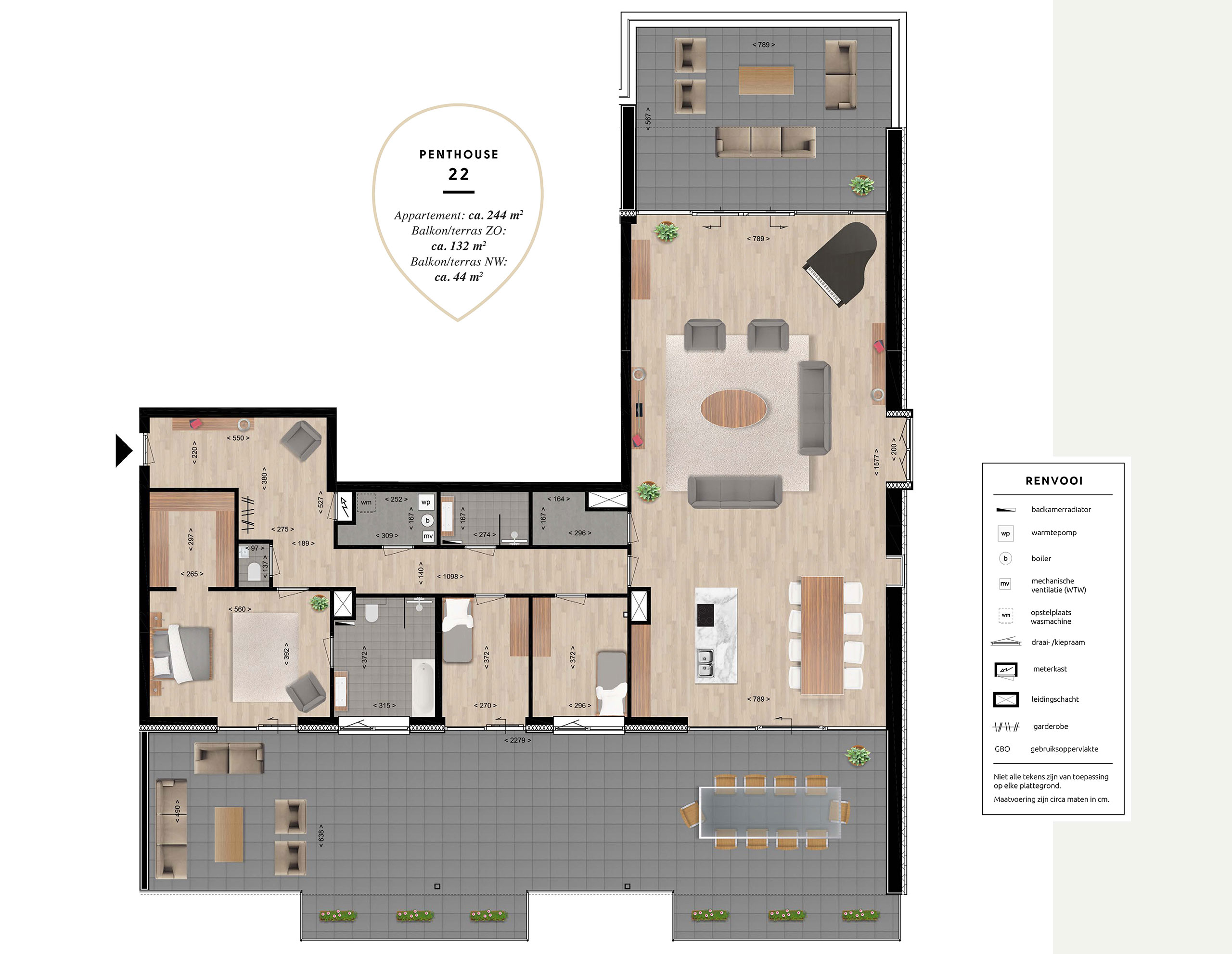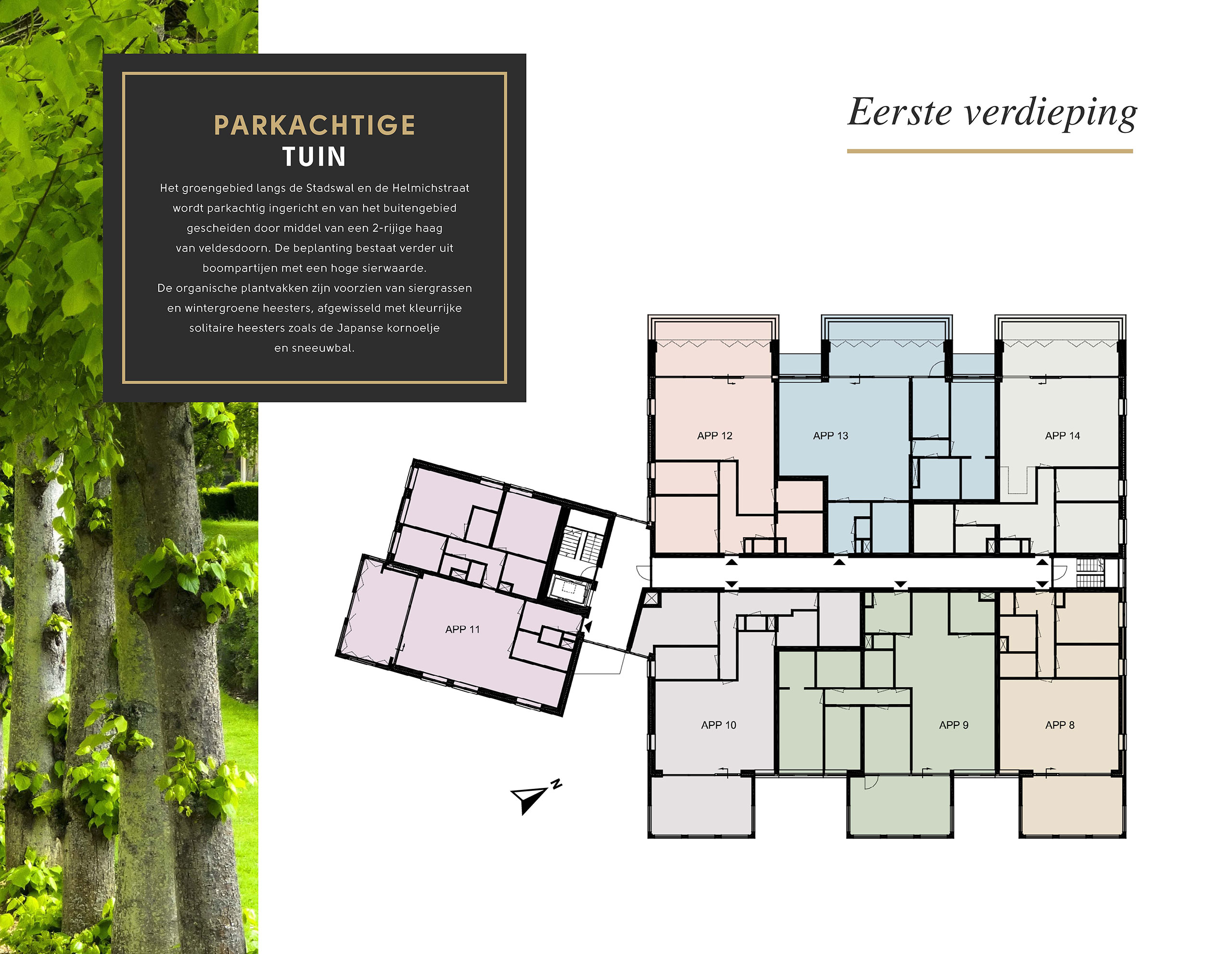 Het bovenste penthouse in de toren beschikt over twee woonlagen, met extra ruimte voor slaap-, hobby- of studieruimte. Het daaronder gelegen penthouse loopt vanaf de toren door naar het lager gelegen gebouw. Alle appartementen en penthouses hebben een berging, inpandige parkeerplaats en fietsenstalling in het souterrain.