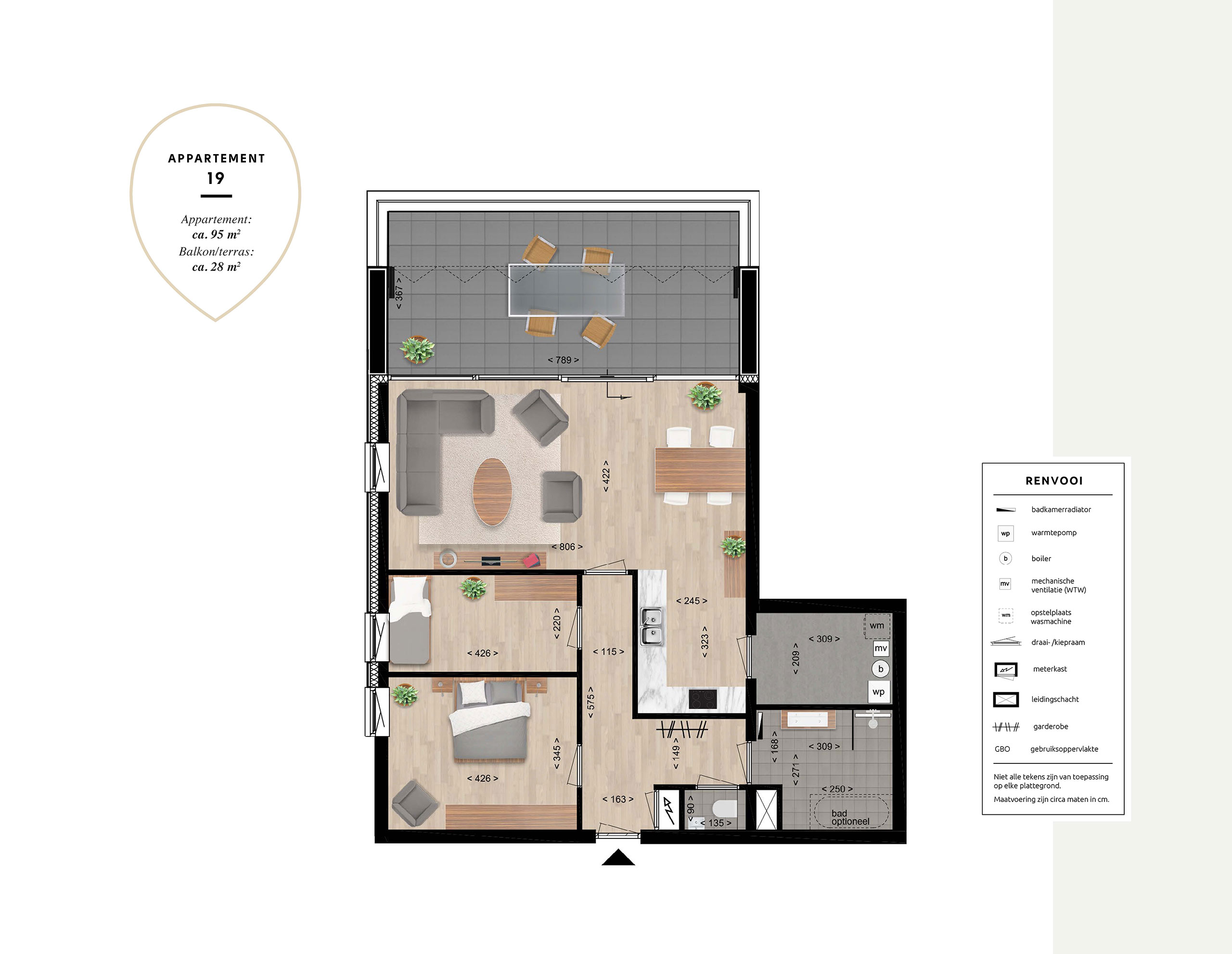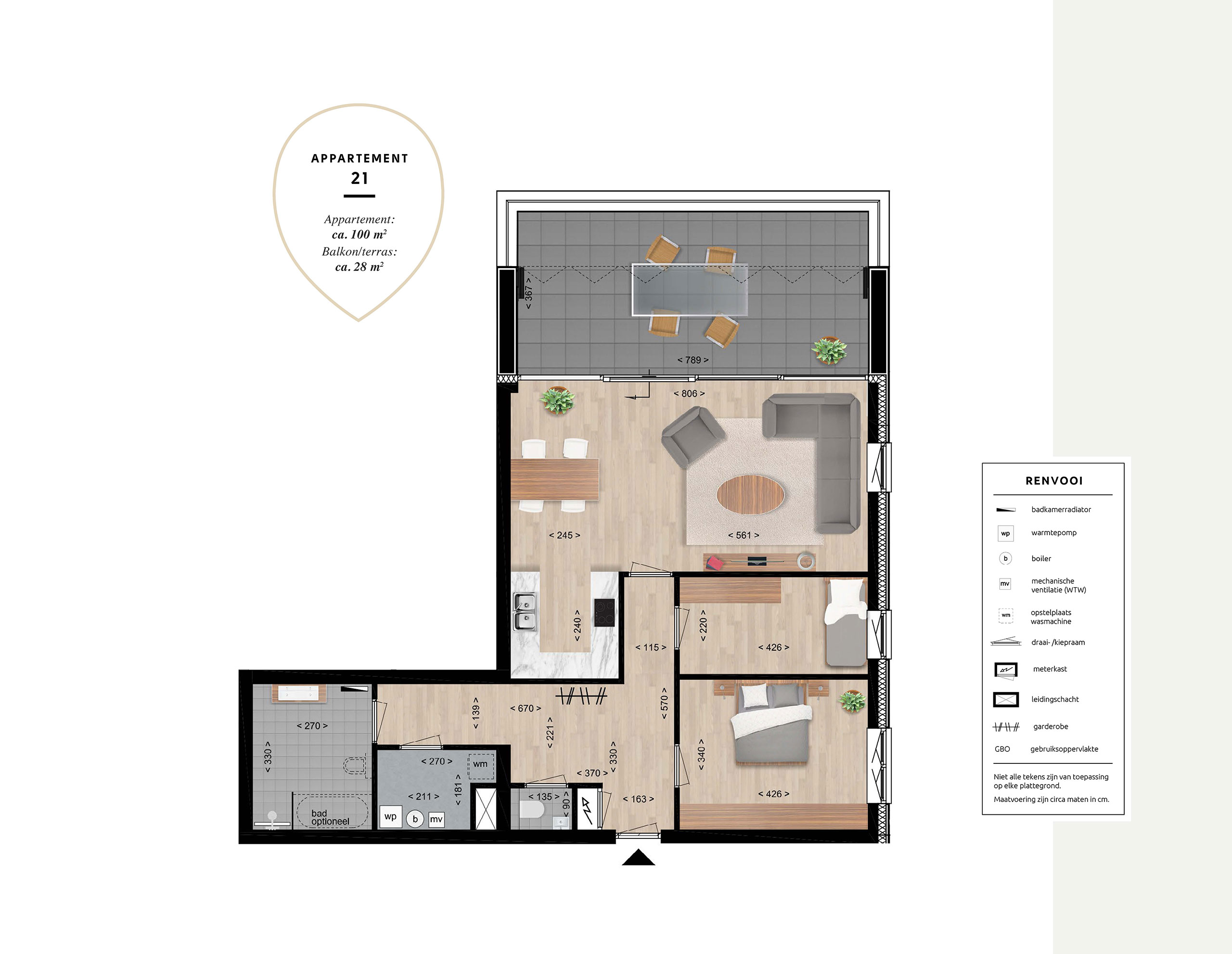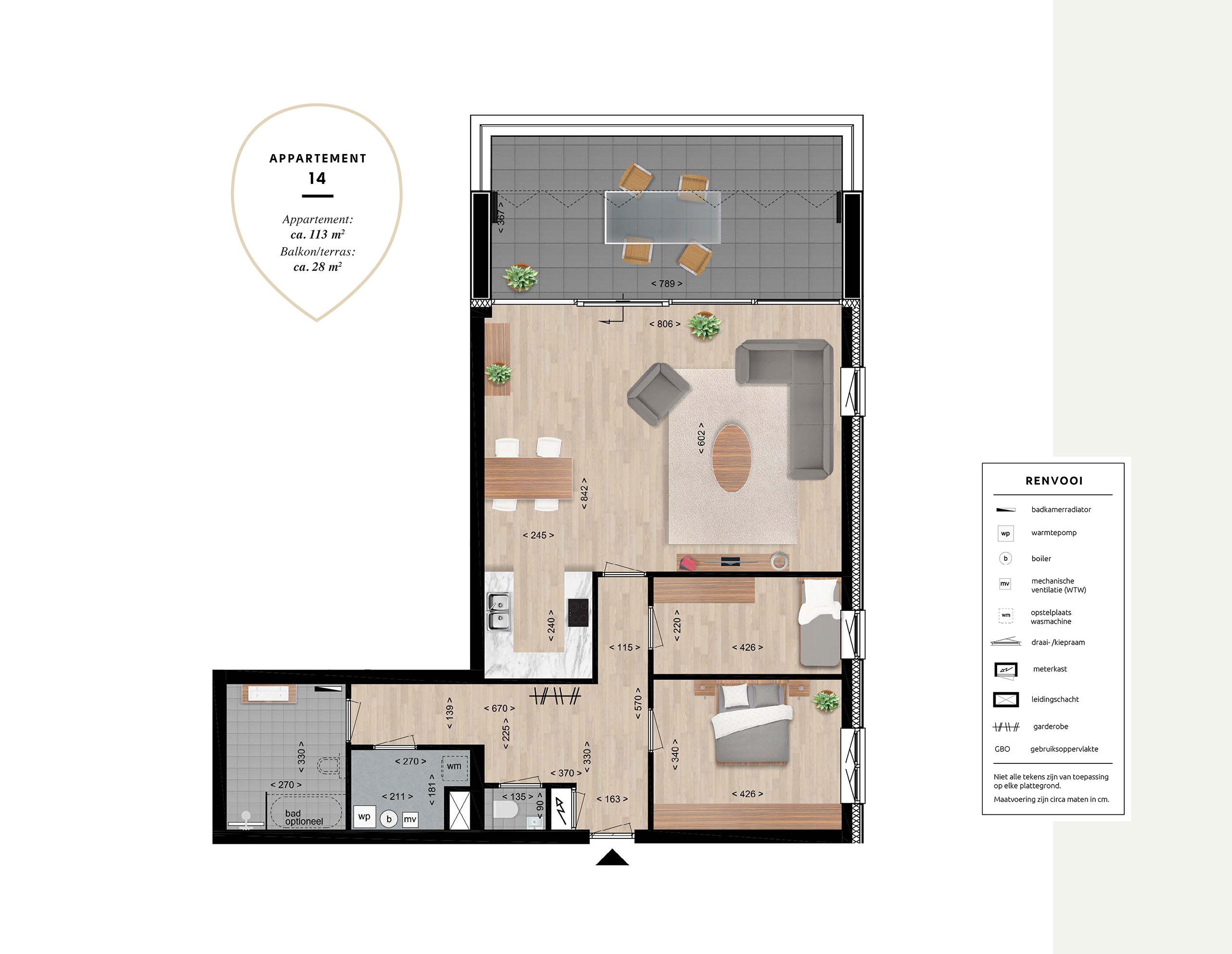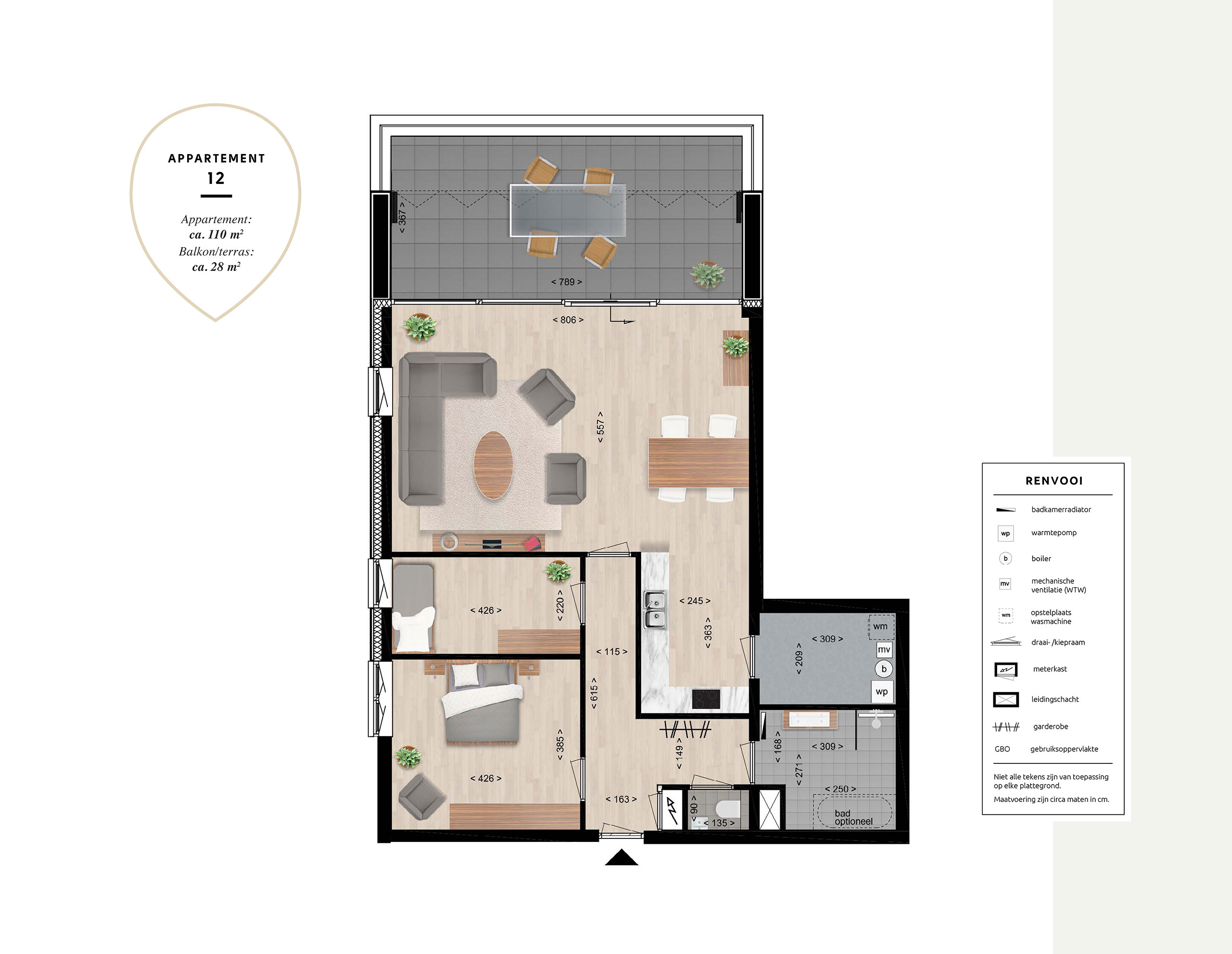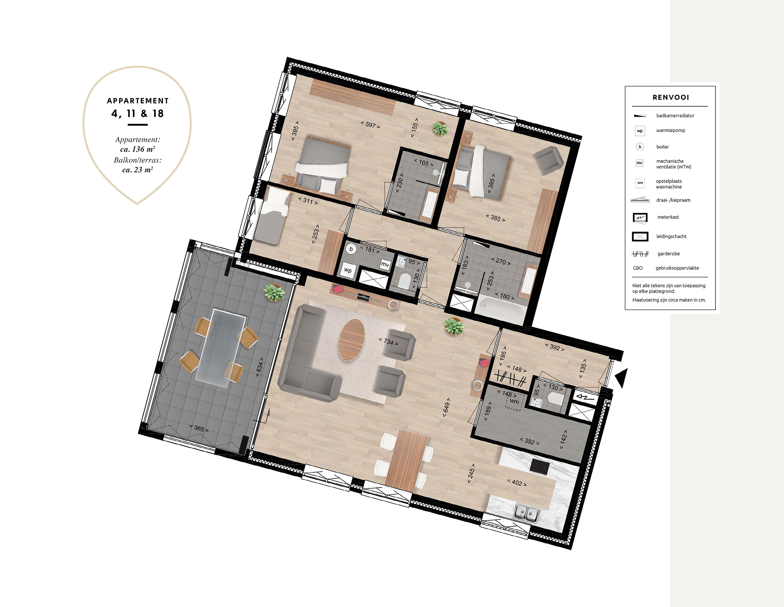Het bovenste penthouse in de toren beschikt over twee woonlagen, met extra ruimte voor slaap-, hobby- of studieruimte. Het daaronder gelegen penthouse loopt vanaf de toren door naar het lager gelegen gebouw. Alle appartementen en penthouses hebben een berging, inpandige parkeerplaats en fietsenstalling in het souterrain.