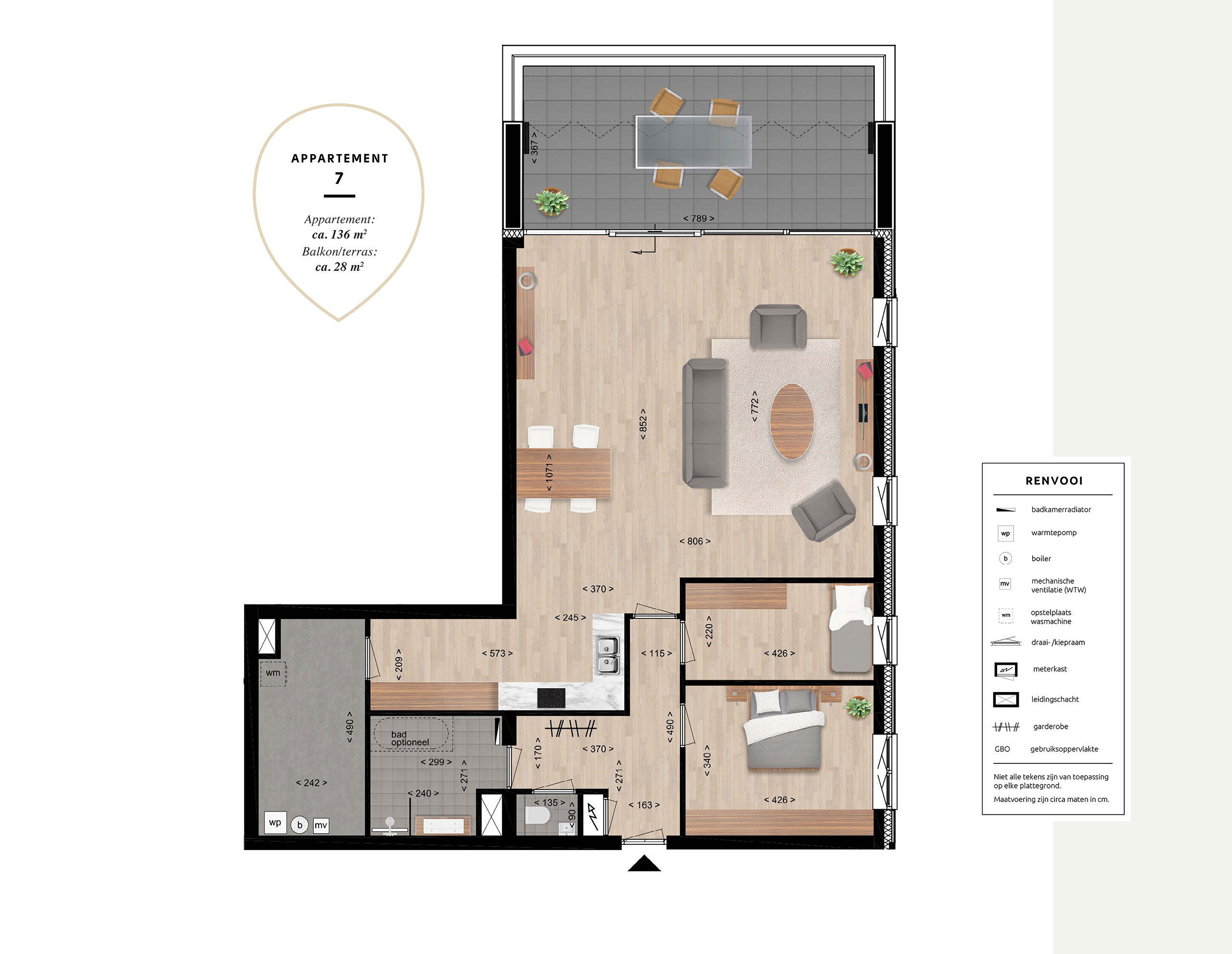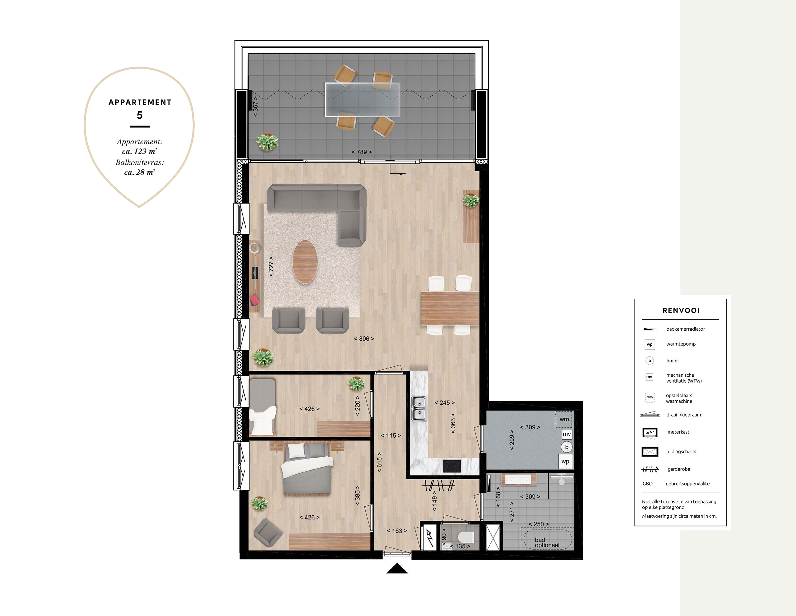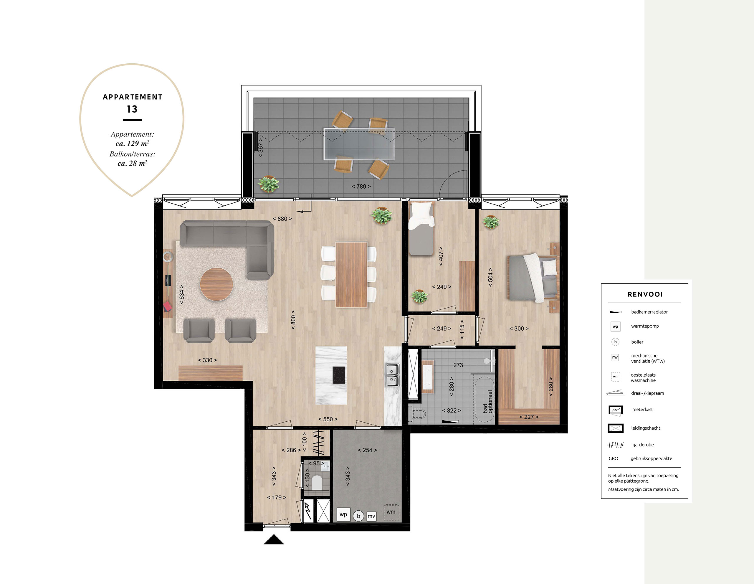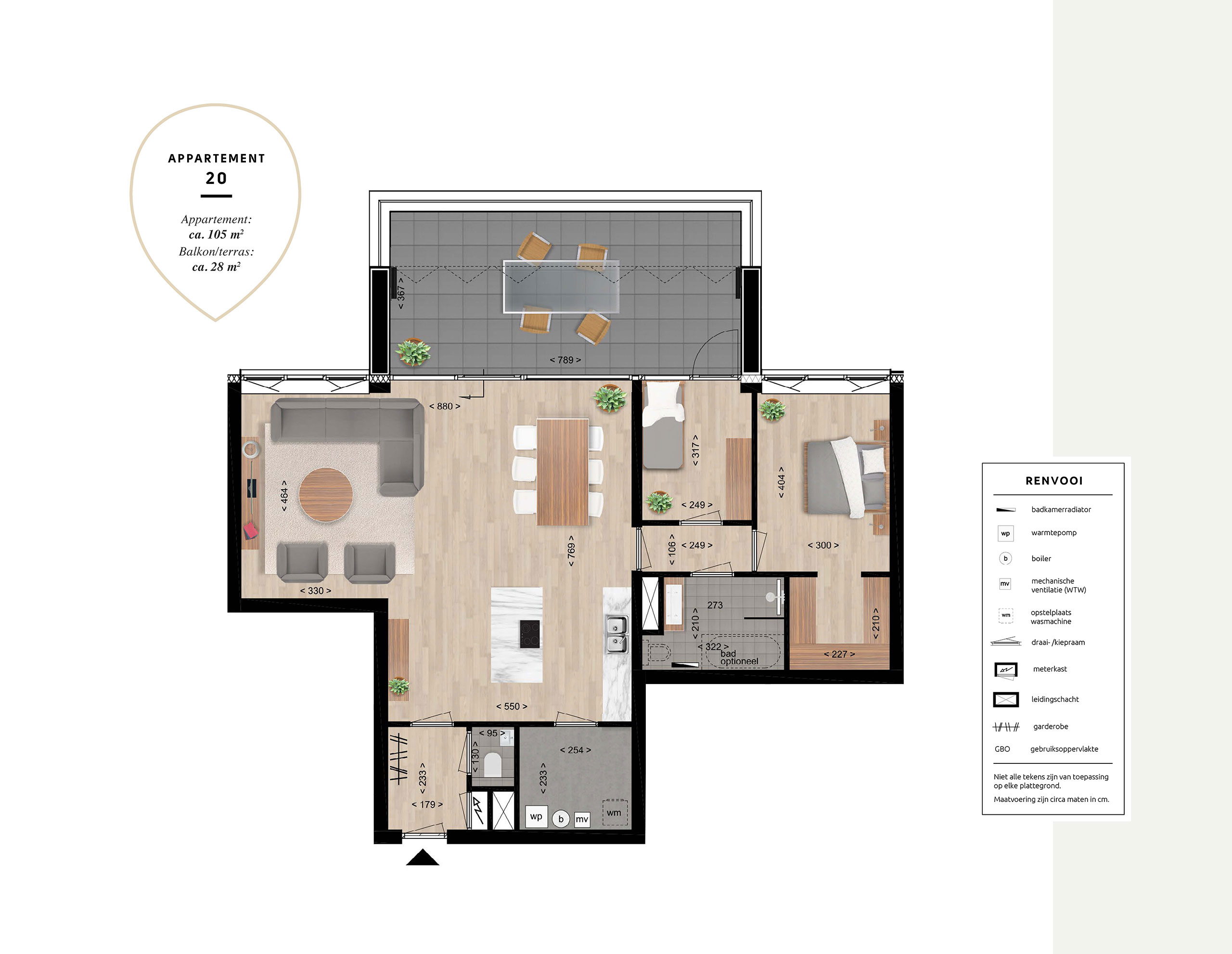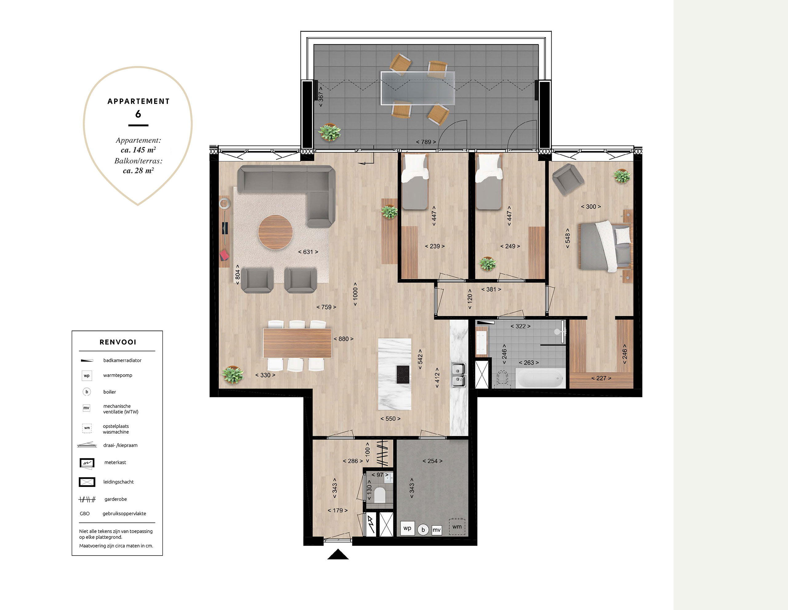 Het bovenste penthouse in de toren beschikt over twee woonlagen, met extra ruimte voor slaap-, hobby- of studieruimte. Het daaronder gelegen penthouse loopt vanaf de toren door naar het lager gelegen gebouw. Alle appartementen en penthouses hebben een berging, inpandige parkeerplaats en fietsenstalling in het souterrain.